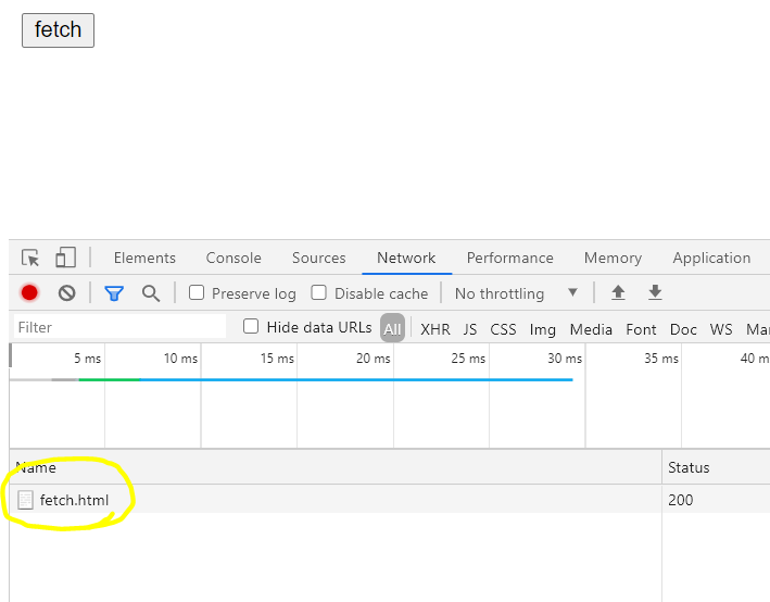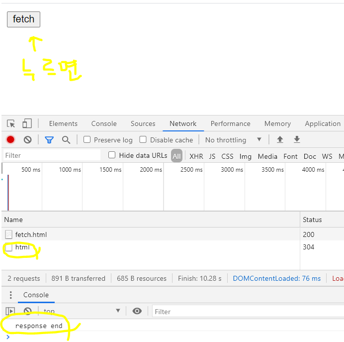 reload 해보면, fetch를 누르기전에는 아까와 마찬가지로 network에 fetch.html밖에 없었다가 누르면 html에 접속해서 데이터를 가져오고, 서버가 응답한다음에 callbackme라는 함수가 실행되면서 response end가 콘솔에 보입니다.
