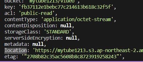aws 콘솔을 확인해보면 영상은 잘 올라갔는데, 우리 개발툴의 콘솔에서는 fileUrl이 필요하다고 에러가 뜬다. 그 부분을 수정해준다.