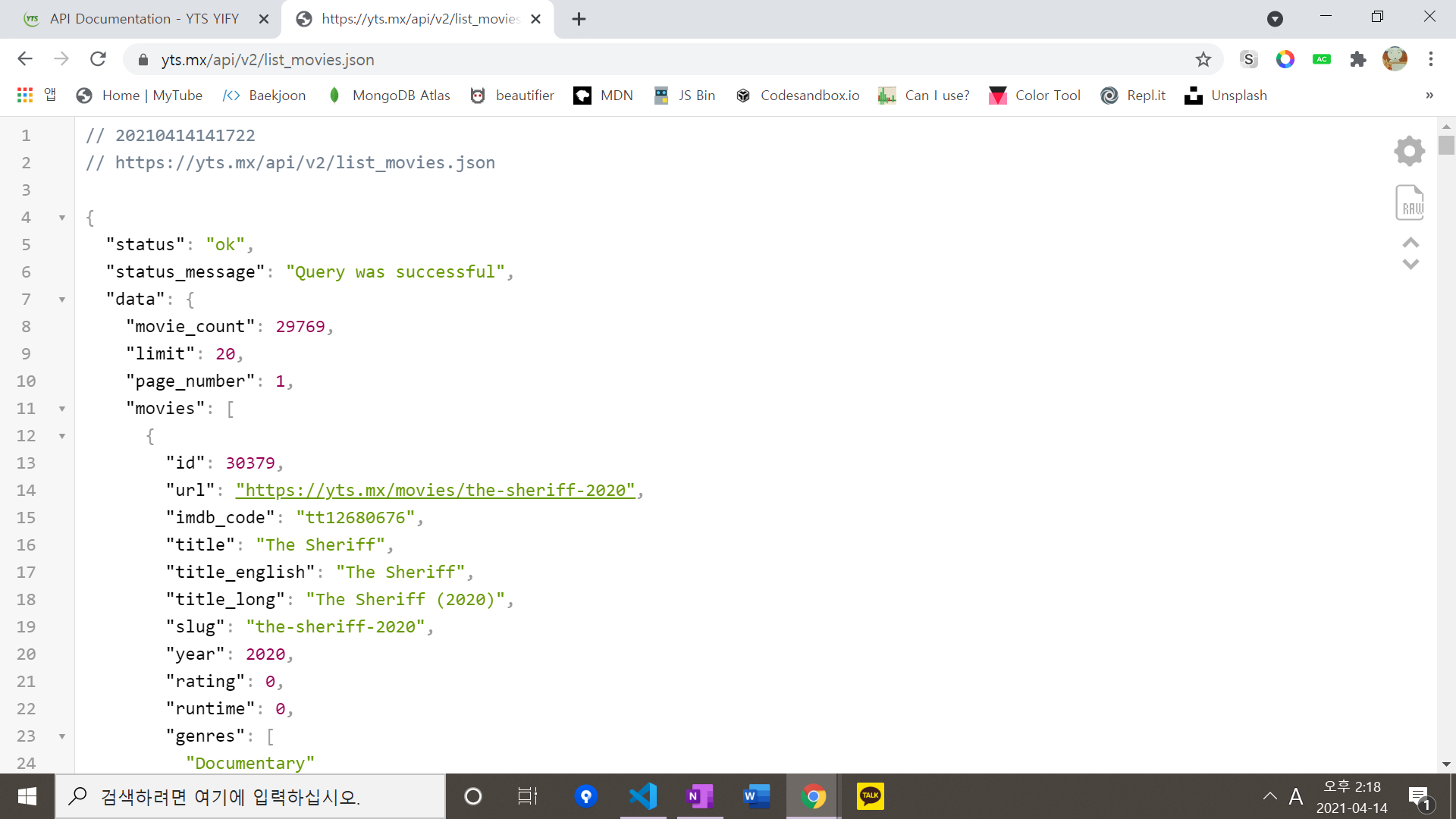 YTS 홈페이지에 들어가서 API를 누르고 JSON 파일을 보면