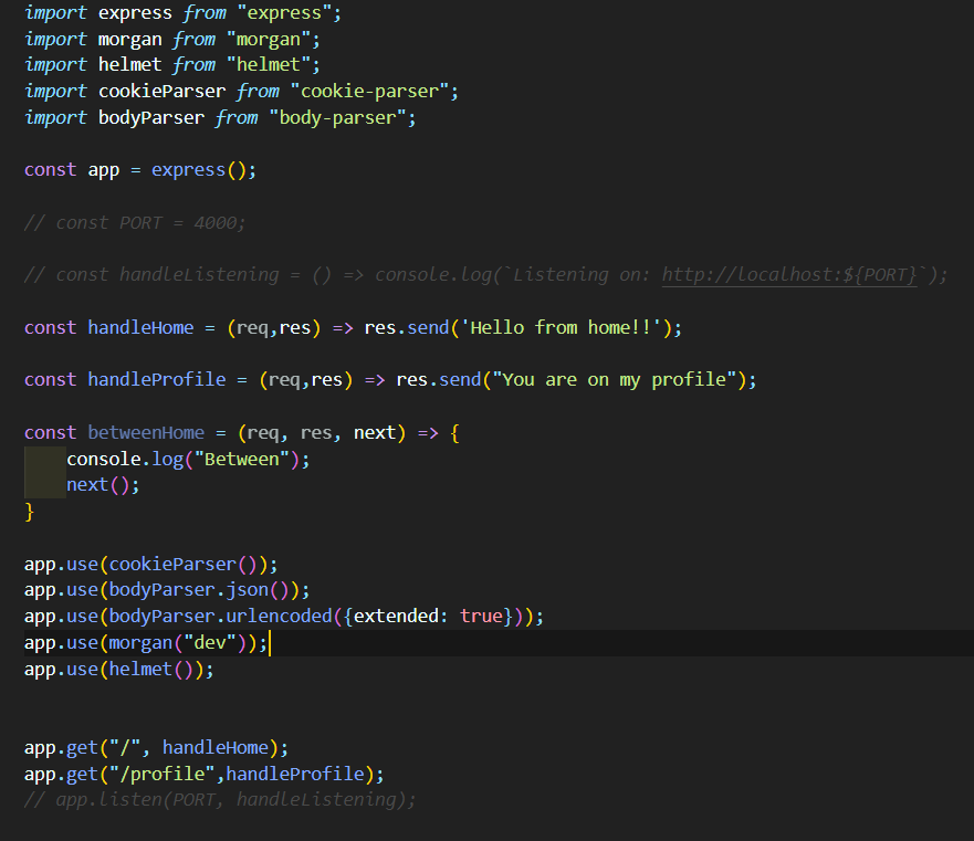 - 저것은 default로 export하지 않고 변수 앞에 export해줬기 때문에 저렇게 export한 것은 import { userRouter } from "./router"; 이렇게 import 해준다. (default로 export했을 때랑 import 방법이 다름)